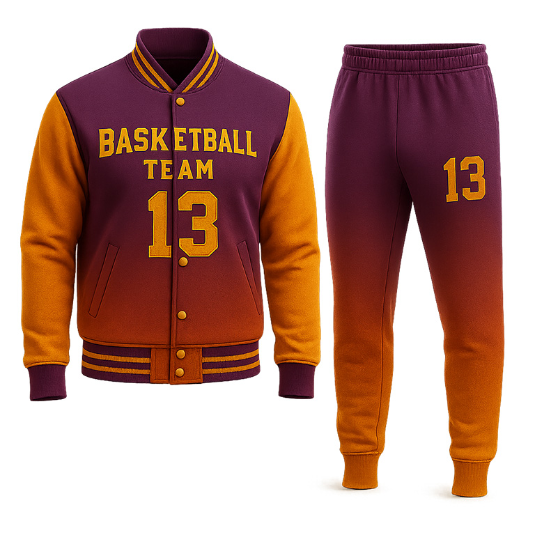 Баскетбольный костюм мужской состоит из кофты-бомбера и прямых спортивных брюк, изготовленных в едином командном стиле. Модель аналогична представленной на фото, но выполняется без кнопок и без молний на штанах, что делает костюм лёгким, удобным и безопасным для активных тренировок.